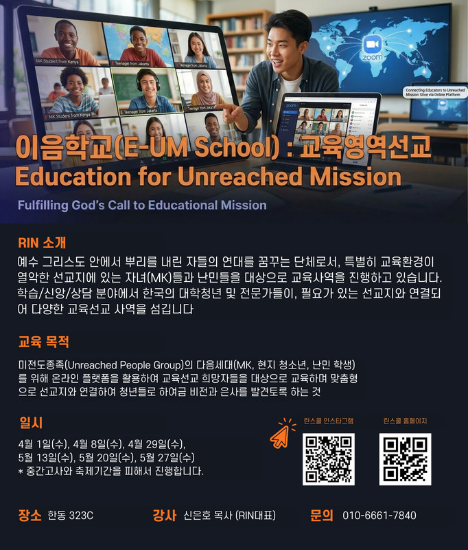 RIN(E-UM School)은 선교지 자녀(MK)와 난민 학생들을 위해 한국 대학생들과 연결하여 온라인 교육을 진행하는 교육선교 단체입니다.